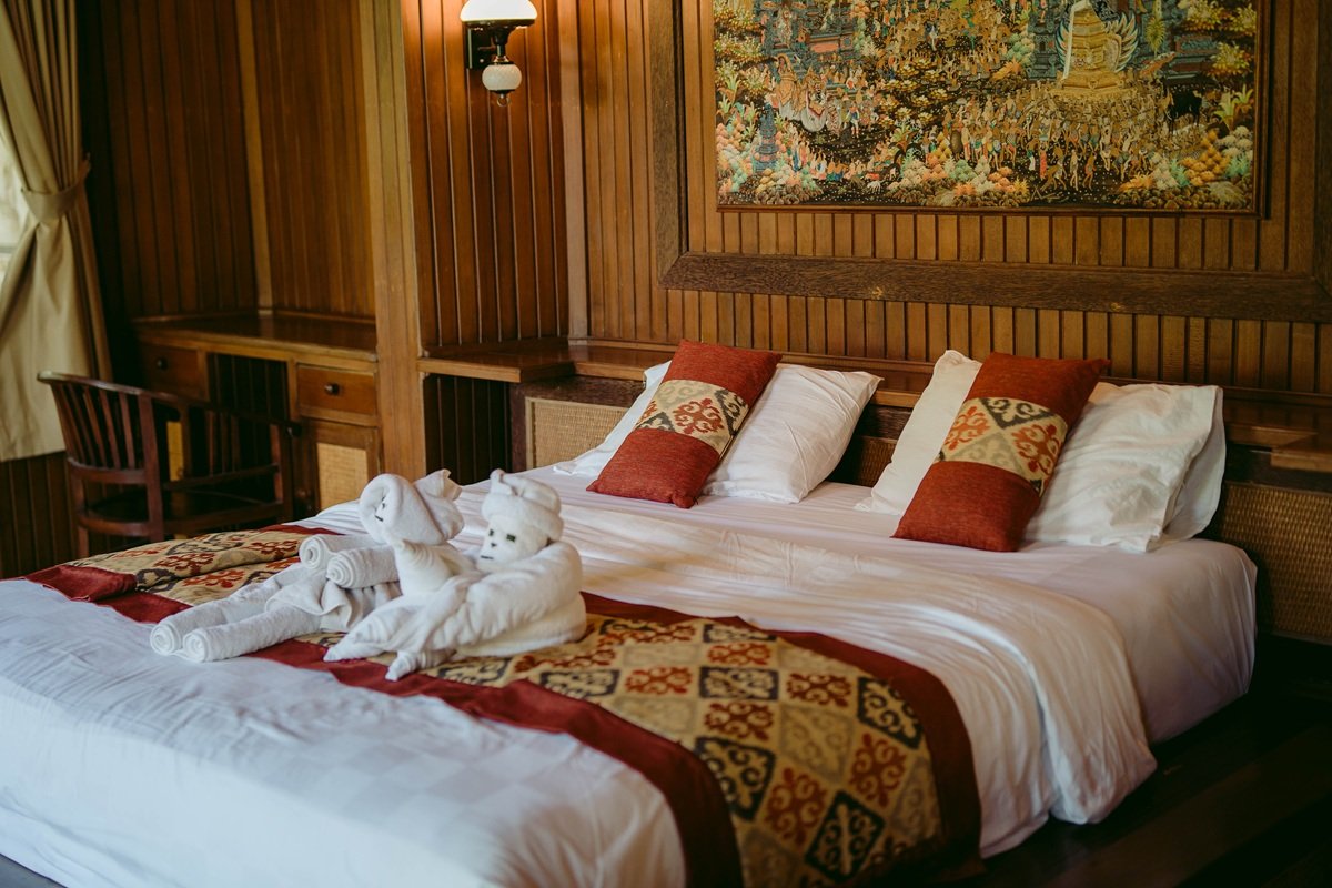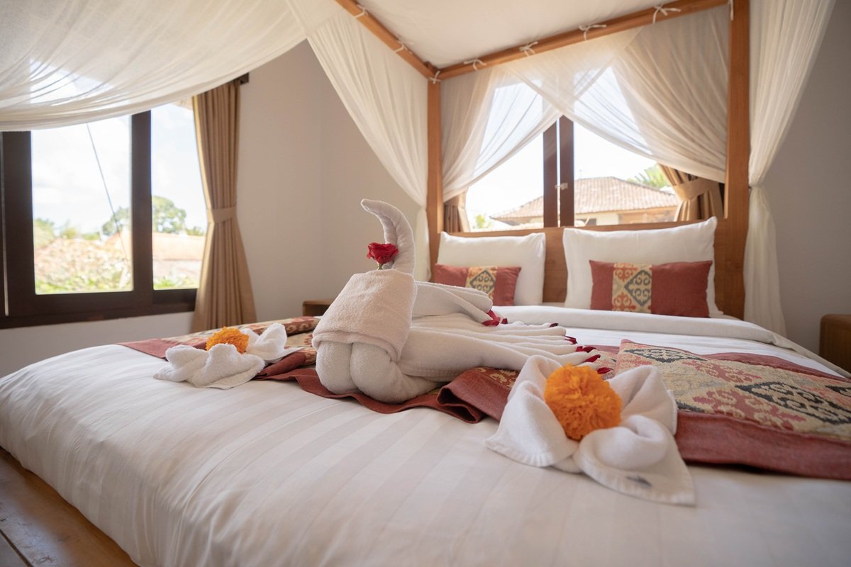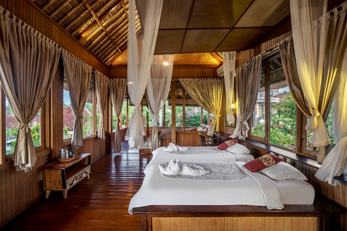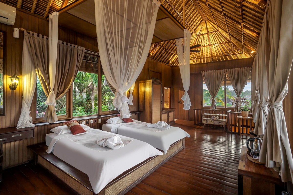 Villa Krishna is a one-bedroom villa with traditional Balinese architecture and detailed stone carvings that reflect local artistry and heritage. The bedroom is set up with two comfortable beds, making it suitable for couples, friends, or a small family looking for a cozy and intimate stay.