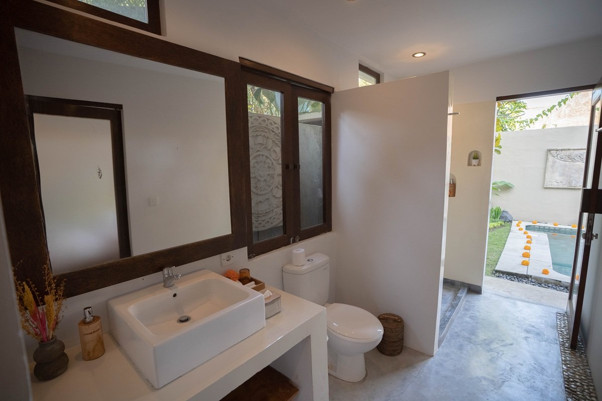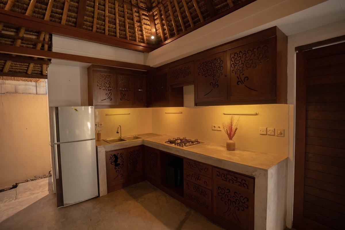 The villa includes a private living room and a simple kitchen with basic utensils for everyday needs. Outside, a private swimming pool and small garden create a peaceful space to unwind, while the carved stone details throughout the villa bring an authentic and timeless Balinese atmosphere.